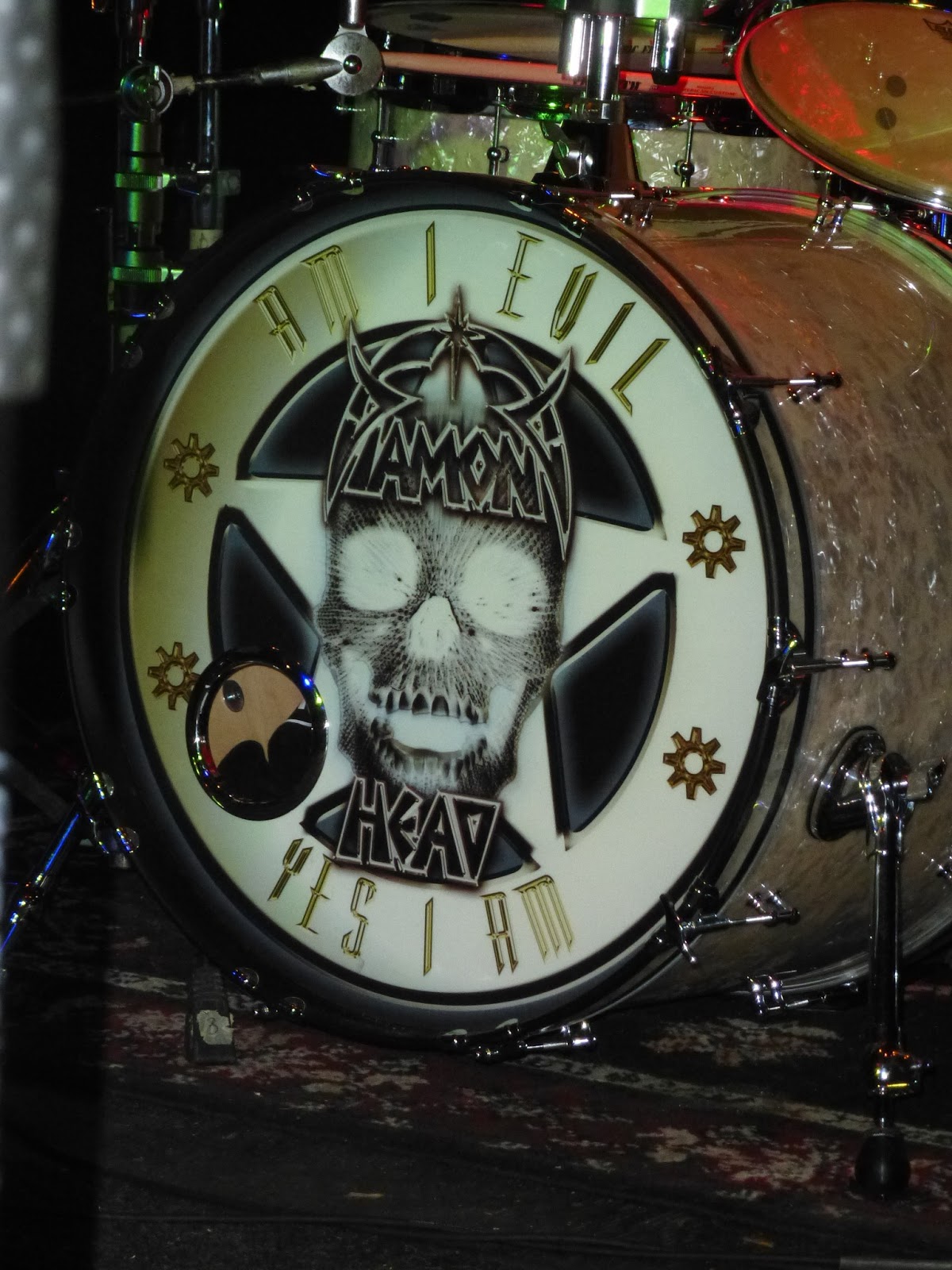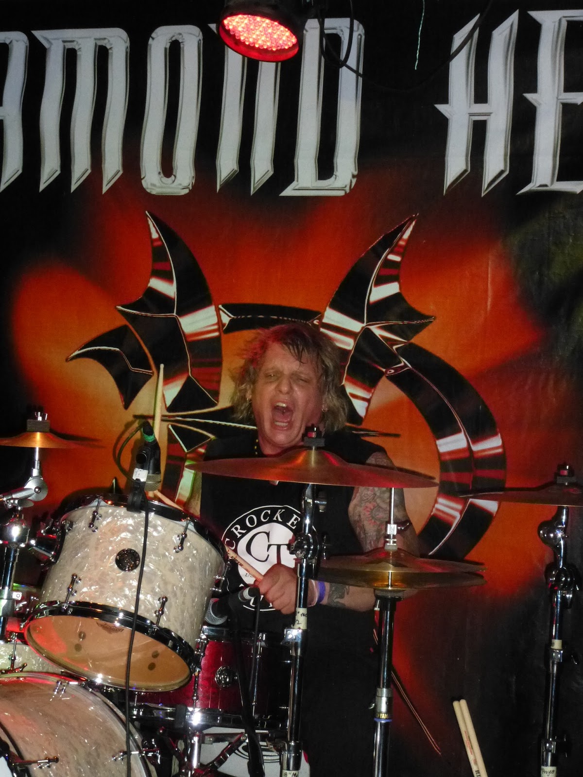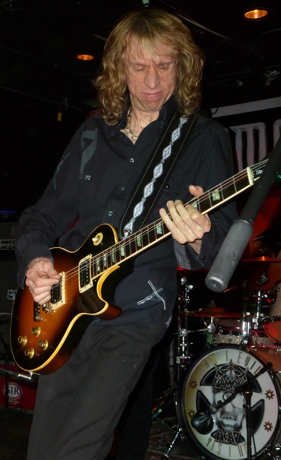 ce as well. The musicians of Diamond Head came on stage starting into Play It Loud and lead vocalist Nick Tart, replacement for original crooner Sean Harris joined a few moments later attempting a dramatic entrance with the delay I suppose. As they ripped into song number two, I Feel No Pain, I was loving the sound! They were bang on musically, to my untrained and partially deafened due to years of loud Diamond Head ears. Bassist Eddie Moohan was all smiles, obviously having fun as was Brian Tatler, both occasionally pointing at someone in the audience with my newly acquired diamond head t-shirt getting a thumbs up from both. By the time they