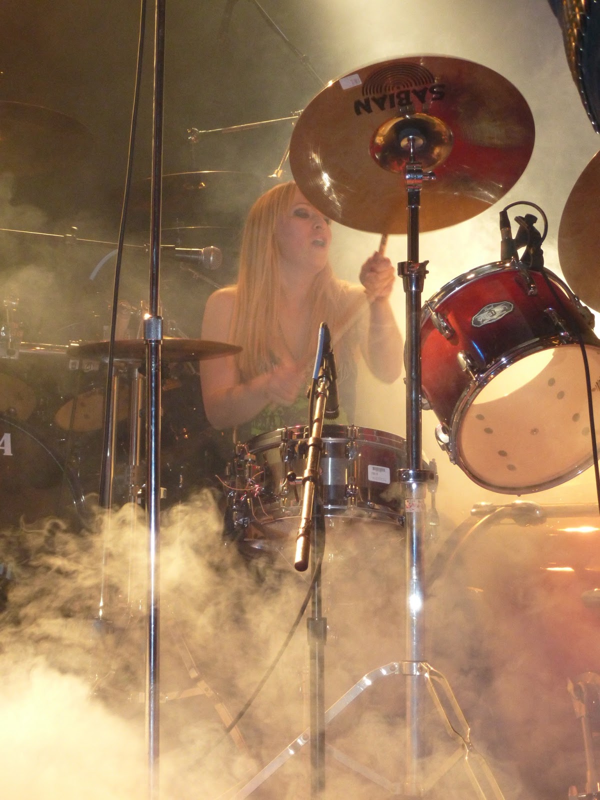 discern that the second song was from their EP (which I intended to purchase after the show) and was called The Rite. I looked around and noticed that several folks in the crowd now had a steady head bob going, starting to get into Axxion and catch their buzz. The singer removed his vest for the third number showing off his hairless and beefy chest. I suspect that he may fancy himself a bit of a beefcake, but a word to the wise here….keep your shirt on bud! As the dry ice smoke continued to fill the stage, Stallion, also from the EP was played in the fourth song position. Following that was what may have been called Wild Racer (?) and the set closer of Crazy Nights, which was one of the tracks that I had checked out on the net and many in the crowd seemed to know it also, singing along. So guys, don’t let the beefy singer deter you, especially if you want to see a hot chick pounding skin and no, that’s not some kind of euphemism, this girl hits hard! Or maybe you just want some good simple 80’s sounding heavy metal check