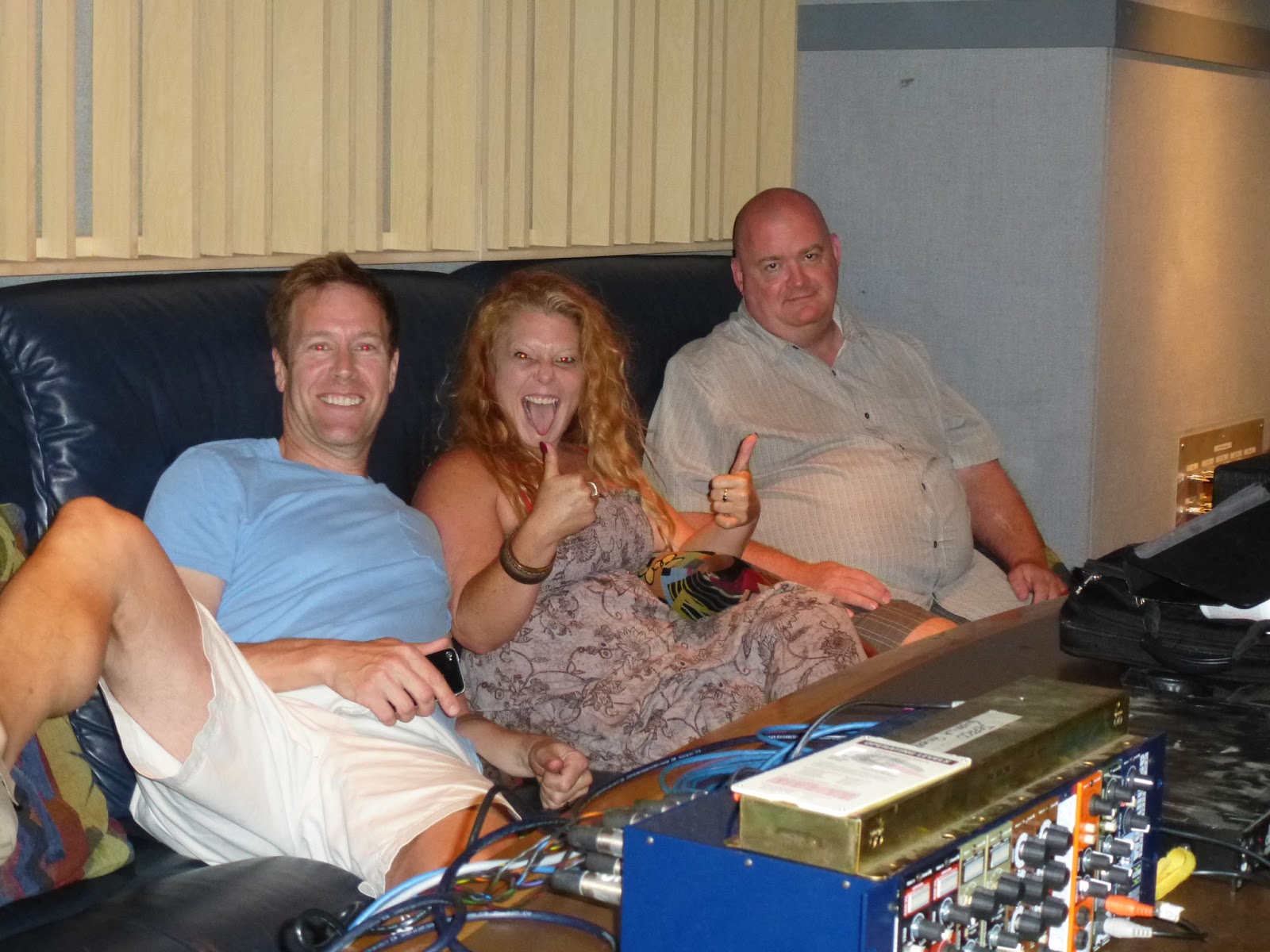 The guitar duo of Scott and John went back in with Michael to lay down the solo part as I got to kick back and enjoy the ride. It was amazing to watch the engineers working away with “pro-tools”, they are truly magicians. The additional guitar sounded great and soon Jim was up next to add in his cymbal shots. Laurie entered the vocal booth to do her thing. We sat behind the glass flashing her the horns and banging our heads as she nailed down a most intense performance.