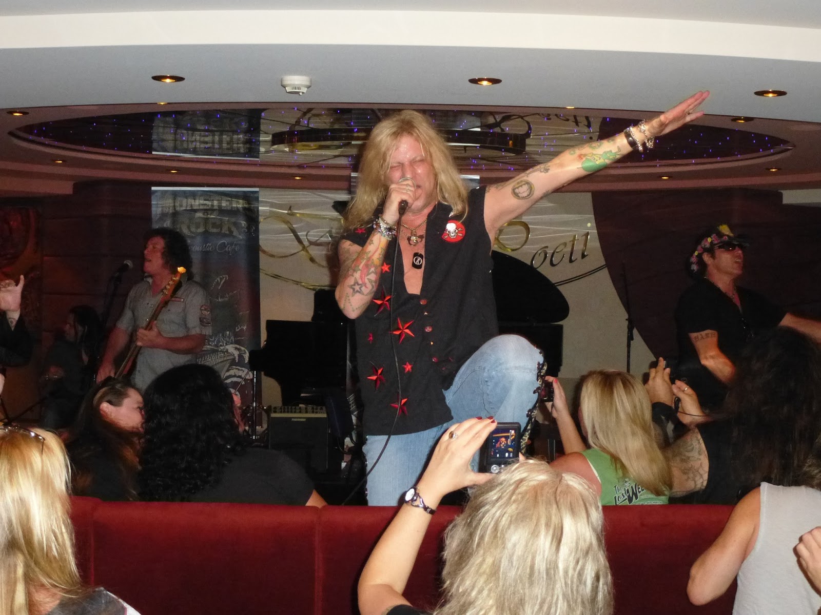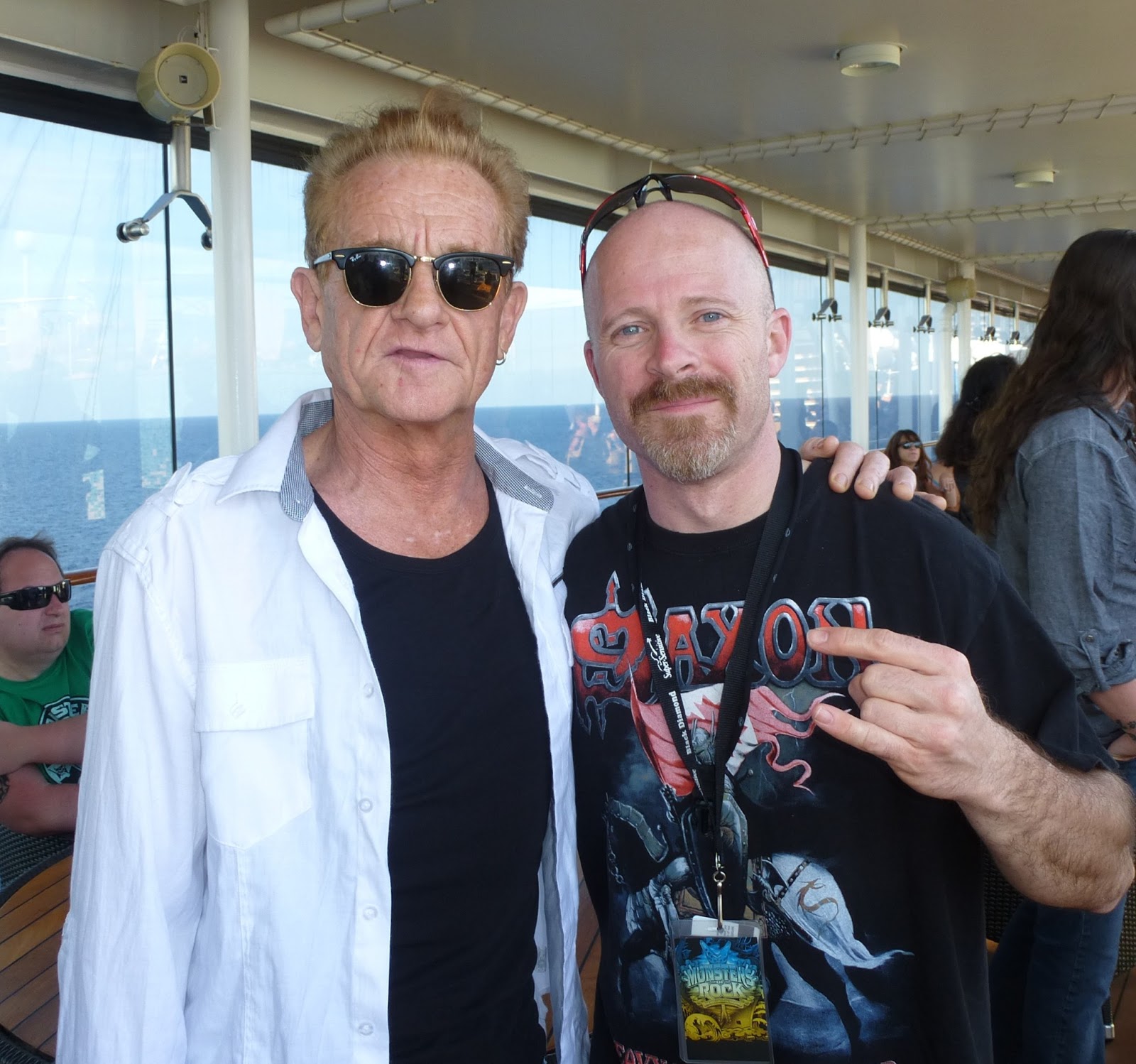 Now I rushed over to the Meet & Greet session featuring Saxon among others. I had to meet the boys, as they are a huge favourite of mine and even appear in my sleeve tattoo. I had been searching all over the boat for members of Saxon to shake their hands, but seemed to miss them every time, while tons of other people kept running into them……just my luck, like a watched kettle never boiling! Also at this meet & greet was Helix and Kaleb (the guitarist) and I had made a loose plan to try and meet up after it was over so that we could bang out our little interview. The line-up was quite long and I felt a little like cattle again as we were herded around. I will not rush to participate in another meet and greet session as they are a sham and waste of time in my eyes. Bands have been sitting there for photos for a couple of hours, are not allowed to sign anything and were generally looking tired and not into it. I will say that my boys from Helix and the girls from Femme Fatale made a great effort and I can’t wait for the photos. It was my heroes of Saxon that looked lifeless, but never the less I dashed in quickly and sat on the couch for my photo, holding up my “Heavy Metal Thunder” flag and had a chance to pass my cards onto Nigel before I was ushered out of the way for the next group. I was anxious to get back out and see more concerts as Black N’ Blue were currently on the pool stage and I made the decision to by-pass John Corabi and Lita Ford who were also in this session and they had huge lines. Unfortunately in that I also made the grievous error of passing by JSRG. I should have stopped by them for a moment as their performance from the Pre-Party was truly mind blowing and in giving it after thought I realised that they were happy posing with their fans as well. I will look out for them aboard ship for sure.