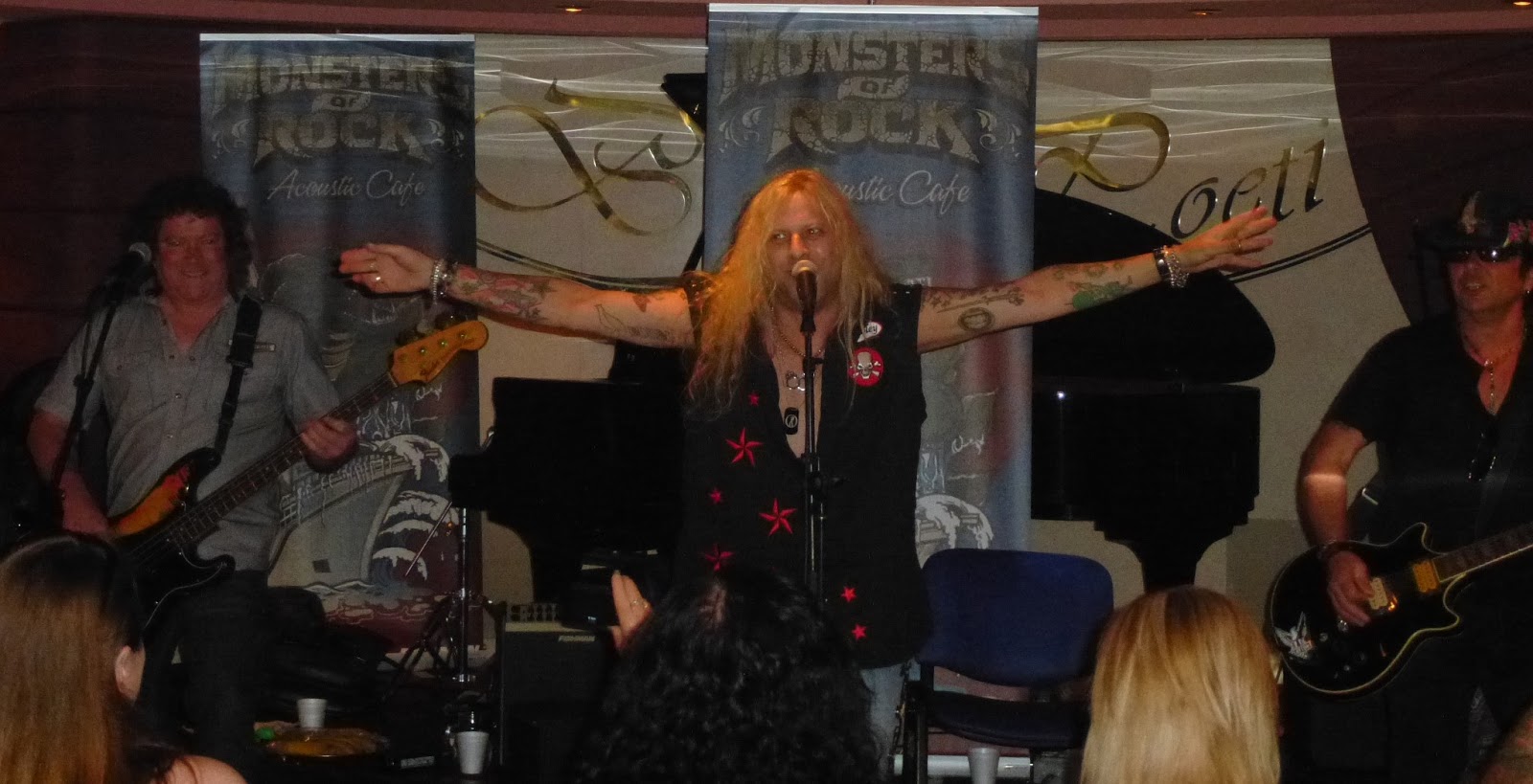 From there it was off to the Acoustic Lounge Bar Dei Poeti to catch Ted Poley. It was great to see that Ted had a full room as last year when I saw him in this venue it was a sparse crowd, probably due to the fact that we were in port and he was playing at 10am. I noticed Ron Keel and his wife in the room as well as Johnny Dee (drummer for Doro/Britny Fox) as Ted welcomed us to his acoustic show and promising to kick us in the teeth at his electric set (which I’d already had witness to at the Rockerz Gone Wild Pool Party). They opened up with a “special song”, The Love Boat which drew a big laugh from the audience and rolled right into Monkey Business, while tossing several bananas into the crowd. Ted is quite a charismatic performer and gets the crowd into his fun set, evidenced by the “Ted Poley” balloons that went out to the crowd next as he played what I think was called Can I Hold You Tonight followed by
