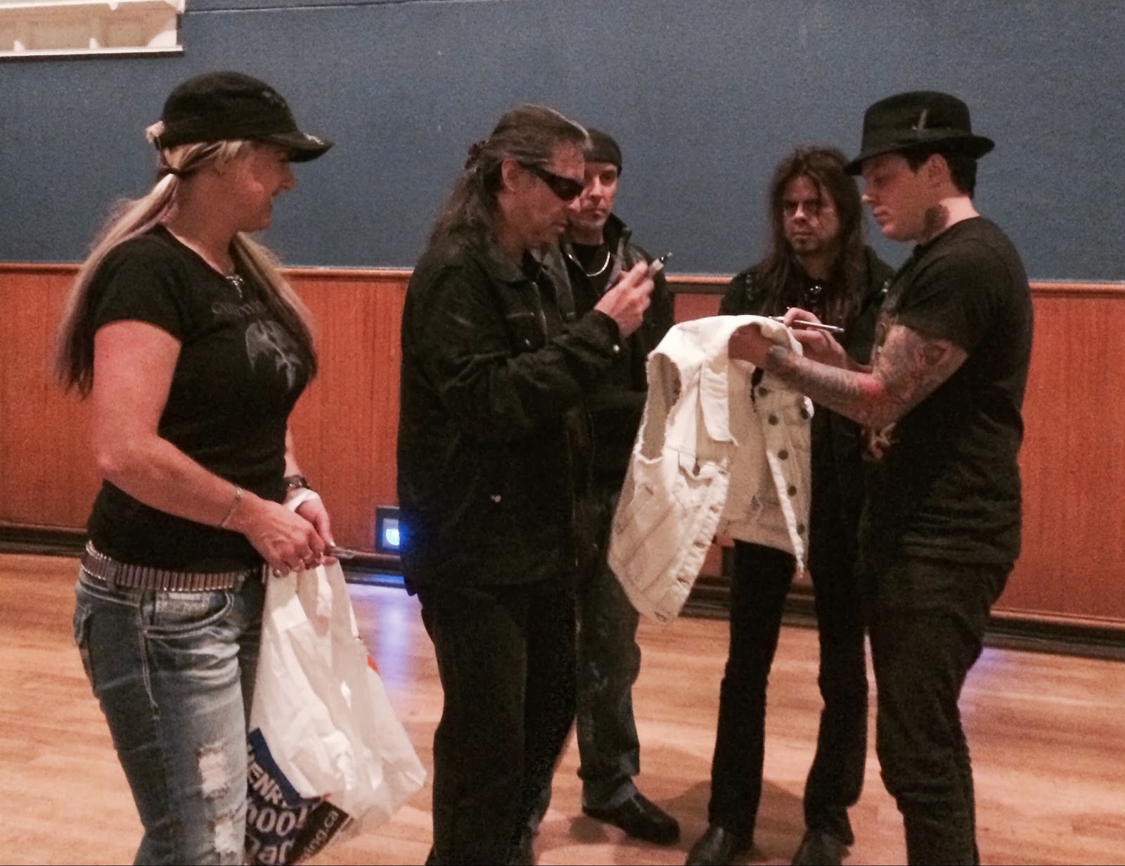 The whole band came down with smiles and hugs. It was truly beyond my wildest dreams. I asked them if I could do individual photos and then a group shot and if they would sign my shirt, my jacket, my CD and my Decibel Geek review of their recent CD. They graciously did it all.