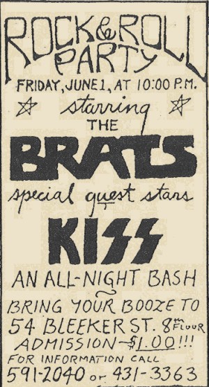 Paul Frehley joined the band in late 1972, by which time Stan had definitely renamed himself Paul Stanley. Luckily Paul Frehley had a cool nickname, Ace. It was Ace who first sketched out a crude design for what would become the band’s logo. Paul Stanley remembers sitting at his parents’ kitchen table in Queens with a protractor, a ruler and a mechanical pencil turning Ace’s idea into the iconic logo instantly recognizable worldwide today. Do you think it crossed his mind as he sat there in his parents’ kitchen that he was making history? I think it might have. When exactly this all took place is unknown, but on a flyer for a June 1, 1973 show at the Bleeker Street loft occupied by fellow NYC rockers The Brats a very basic version of the logo was used.
