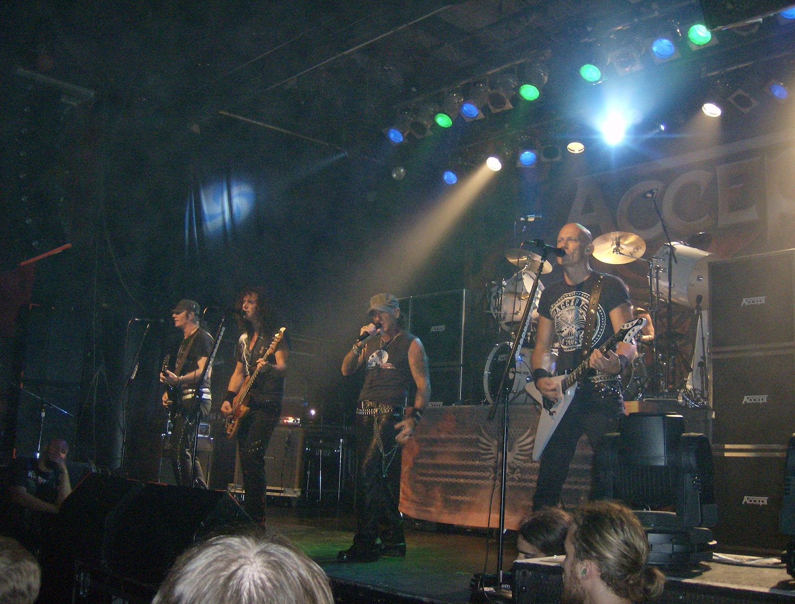 the beer purchase and wormed my way to within one person away from Wolf Hoffman‘s side of the stage. In talking to the guy next to me I was able to determine that I had not missed much as “Hellfire” from the Stalingrad CD was the second tune. We had only missed “Hung, Drawn & Quartered”! The classic “Restless and Wild” was next up to the delight of the crowd, the sweat already beginning to roll off Hoffman‘s shaven head. “Write a letter, you’ll feel better” claims “Losers and Winners” from the iconic Balls to the Wall record. Mark announced that they’d like to do a couple from the latest CD as the opening notes of “Stalingrad” rang out, followed by “Shadow Soldiers”. They sounded tight and you could tell that Peter (Baltes), Mark (Tornillo) and Wolf were having a great time as they pounded through my personal favourite track off of the Blood of the Nations CD in “Pandemic”. A deep cut from 1981’s Breaker found them launching into the title track from that record and then into another newer song with “Bucket Full of Hate”. The boys looked happy to be on stage, especially guitarist Wolf Hoffman. His broad smiles and facial expressions enticed everyone in the crowd into loud cheers as he started the familiar opening riff to “Princess of the Dawn”. From some angles, he even resembled Bruce Willis as the familiar blue glow from dozens of cameras and cell phones spotted the audience. “Up To the Limit” off the Metal Heart CD was a bit of a pleasant surprise. “Teutonic Terror” brought a surge from the crowd as they chanted along, making axe chopping motions to coincide with the line from the chorus. The “Metal Heart” pounded in next and during the guitar solo, in the bask of the greenish stage lighting, Wolf almost looked a little like Gollum from Lord of the Rings as he bent low to the stage, staring out into the audience.